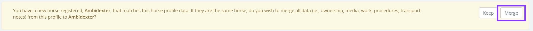 Before merging, please check that only one of the horse profiles have owners or location history records. If both profiles have owners and/or location data, please contact